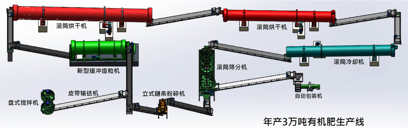 生產線設備包含發酵設備、攪拌機、造粒機、烘干機、冷卻機、滾筒篩分機、料倉、全自動包裝機、立式破碎機、皮帶輸送機等。
