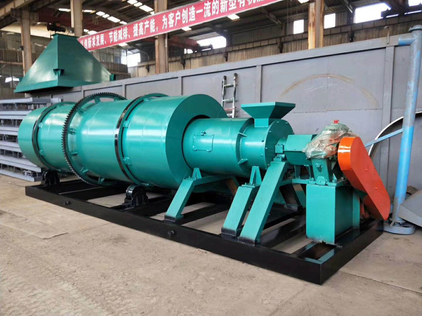 物料通過輸送機進入旋轉滾筒內部,滾筒內部設有揚料裝置,使物料沿筒壁翻滾。