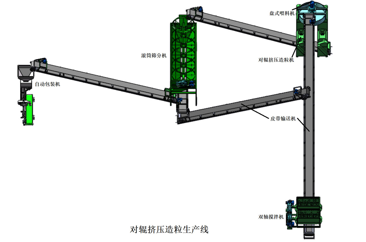 無烘干擠壓造粒生產線包括自動配料機、皮帶輸送機、雙軸攪拌機、盤式喂料機、擠壓造粒機、滾筒篩分機、成品倉庫、自動包裝機等。